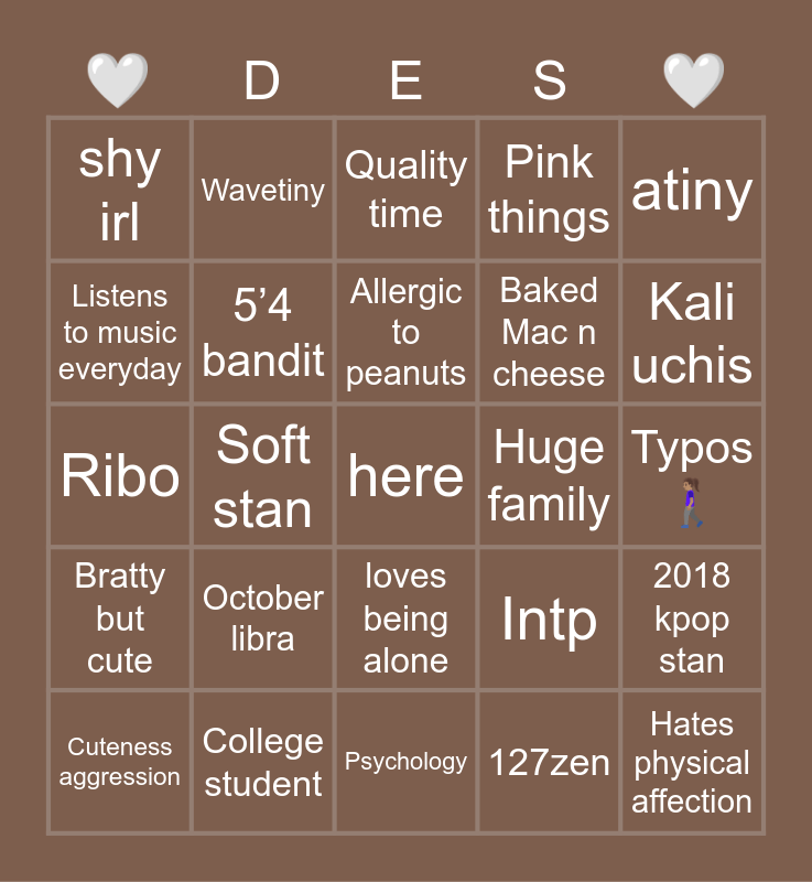 This bingo card has a free space and 24 words: October libra, College student, Allergic to peanuts, Cuteness aggression, atiny, shy irl, Listens to music everyday, Wavetiny, Huge family, loves being alone, Baked Mac n cheese, Ribo, Intp, 2018 kpop stan, 5’4 bandit, 127zen, Typos🚶🏽♀️, Quality time, Kali uchis, Soft stan, Hates physical affection, Bratty but cute, Pink things and Psychology.