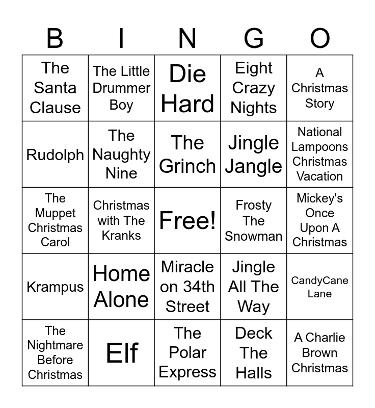 This bingo card has a free space and 24 words: Home Alone, Elf, The Grinch, The Nightmare Before Christmas, A Christmas Story, The Santa Clause, Rudolph, The Little Drummer Boy, Frosty The Snowman, Miracle on 34th Street, Jingle Jangle, The Muppet Christmas Carol, Jingle All The Way, CandyCane Lane, The Naughty Nine, Deck The Halls, Mickey's Once Upon A Christmas, Die Hard, National Lampoons Christmas Vacation, Christmas with The Kranks, A Charlie Brown Christmas, Krampus, Eight Crazy Nights and The Polar Express.