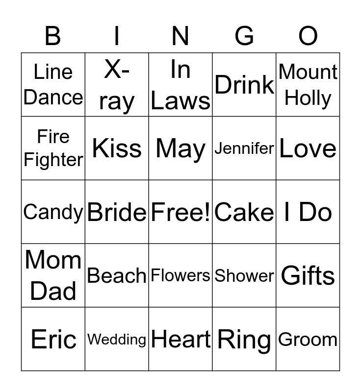 This bingo card has a free space and 24 words: Beach, Wedding, May, Eric, Mount Holly, Line Dance, Fire Fighter, X-ray, Cake, Flowers, Jennifer, Candy, Shower, Gifts, Kiss, Ring, I Do, In Laws, Love, Bride, Groom, Mom Dad, Drink and Heart.