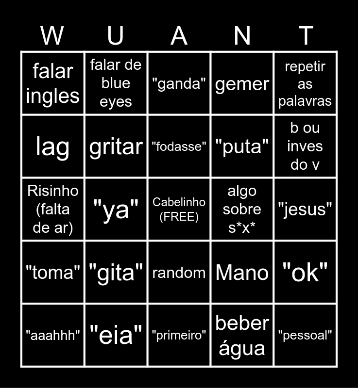 This bingo card has a free space and 24 words: "gita", "eia", "fodasse", "aaahhh", repetir as palavras, falar ingles, lag, falar de blue eyes, algo sobre s*x*, random, "puta", Risinho (falta de ar), Mano, "ok", gritar, beber água, "jesus", "ganda", b ou inves do v, "ya", "pessoal", "toma", gemer and "primeiro".
