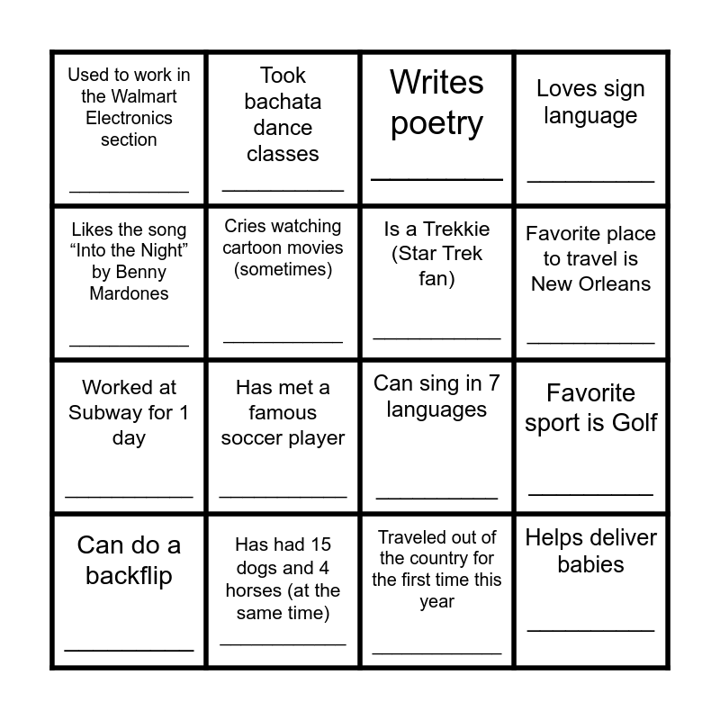 This bingo card has 22 words: Has had 15 dogs and 4 horses (at the same time) ____________, Enjoys deep-sea fishing __________, Took bachata dance classes __________, Has a VHS copy of Air Force One __________, Cries watching cartoon movies (sometimes) ____________, Is a Trekkie (Star Trek fan) ___________, Used to work in the Walmart Electronics section ____________, Writes poetry _______, Can sing in 7 languages __________, Helps deliver babies __________, Worked at Subway for 1 day ___________, Loves sign language __________, Has had lunch with First Lady Barbara Bush ____________, Has an MBA _________, Traveled out of the country for the first time this year _____________, Enjoys playing soccer _________, Favorite sport is Golf _________, Can do a backflip _________, Has met a famous soccer player ___________, Likes the song “Into the Night” by Benny Mardones ____________, Favorite place to travel is New Orleans ___________ and Is 1 of 5 sisters _________.