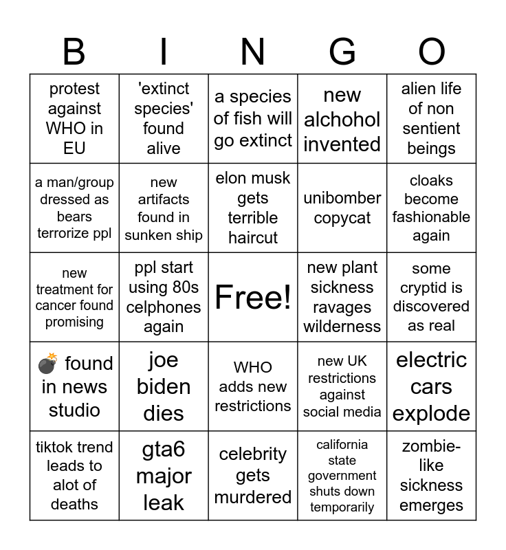 This bingo card has a free space and 24 words: joe biden dies, gta6 major leak, elon musk gets terrible haircut, tiktok trend leads to alot of deaths, alien life of non sentient beings, protest against WHO in EU, a man/group dressed as bears terrorize ppl, 'extinct species' found alive, new plant sickness ravages wilderness, WHO adds new restrictions, unibomber copycat, new treatment for cancer found promising, new UK restrictions against social media, electric cars explode, new artifacts found in sunken ship, california state government shuts down temporarily, some cryptid is discovered as real, a species of fish will go extinct, cloaks become fashionable again, ppl start using 80s celphones again, zombie-like sickness emerges, 💣 found in news studio, new alchohol invented and celebrity gets murdered.