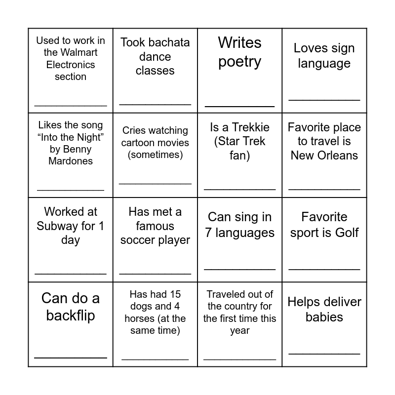 This bingo card has 22 words: Has had 15 dogs and 4 horses (at the same time) ____________, Enjoys deep-sea fishing __________, Took bachata dance classes ___________, Has a VHS copy of Air Force One ___________, Cries watching cartoon movies (sometimes) _____________, Is a Trekkie (Star Trek fan) ___________, Used to work in the Walmart Electronics section _____________, Writes poetry ________, Can sing in 7 languages __________, Helps deliver babies __________, Worked at Subway for 1 day ___________, Loves sign language __________, Has had lunch with First Lady Barbara Bush ___________, Has an MBA ________, Traveled out of the country for the first time this year _____________, Enjoys playing soccer __________, Favorite sport is Golf __________, Can do a backflip _________, Has met a famous soccer player ___________, Likes the song “Into the Night” by Benny Mardones ____________, Favorite place to travel is New Orleans ___________ and Is 1 of 5 sisters _________.