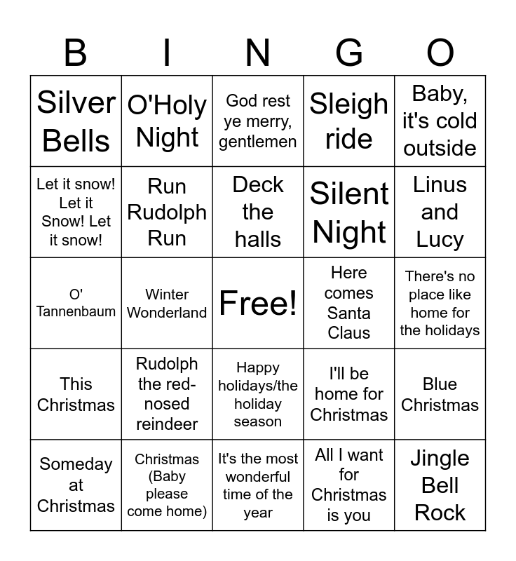 This bingo card has a free space and 50 words: A holly Jolly Christmas, Jingle Bell Rock, It's beginning to look a lot like Christmas, It's the most wonderful time of the year, Rudolph the red-nosed reindeer, Frosty the snowman, O'Holy Night, White christmas, Let it snow! Let it Snow! Let it snow!, Rocking around the Christmas tree, Run Rudolph Run, Sleigh ride, Blue Christmas, I'll be home for Christmas, You're a mean one Mr. Grinch, Have yourself a merry little Christmas, Deck the halls, Here comes Santa Claus, Feliz Navidad, Baby, it's cold outside, Winter Wonderland, All I want for Christmas is you, Silver Bells, Silent Night, Christmas time is here, Adeste Fideles, Linus and Lucy, What Christmas means to me, God rest ye merry, gentlemen, Happy holidays/the holiday season, Do you hear what I hear, Little drummer boy, Last Christmas, The Christmas song (Merry Christmas to you), Christmas (Baby please come home), Santa Claus is coming to town, Little St. Nick, Santa Baby, Jingle Bells, There's no place like home for the holidays, Mele Kalikimaka, Wonderful Christmas time, O come all ye faithful, The First Noel, Someday at Christmas, O' Tannenbaum, Merry Christmas Baby, I saw Mommy kissing Santa Claus, This Christmas and Happy Xmas (The war is over).