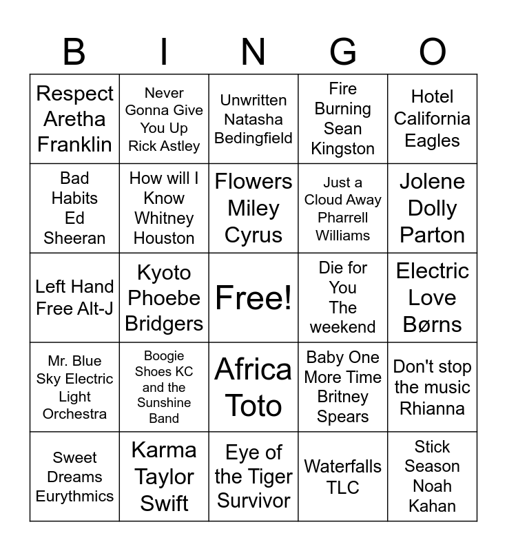This bingo card has a free space and 59 words: Circles Post Malone, Karma Taylor Swift, Ain't No Mountain High Enough Tammi Terrell and Marvin Gaye, Mr. Blue Sky Electric Light Orchestra, Waterfalls TLC, Misery Business Paramore, How will I Know Whitney Houston, Kill Bill SZA, Just a Cloud Away Pharrell Williams, What was I made for? Billie Eilish, Fire Burning Sean Kingston, Express Yourself Charles Wright & The Watts, Bad Habits Ed Sheeran, Dreams Fleetwood Mac, More Than a Woman Bee Gees, Respect Aretha Franklin, Stick Season Noah Kahan, Hotel California Eagles, Chicken Fried Zac Brown Band, Flowers Miley Cyrus, Die for You The weekend, Unwritten Natasha Bedingfield, Sweet Dreams Eurythmics, Don't stop the music Rhianna, Since U Been Gone Kelly Clarkson, Goodbye Earl The Chicks, Yesterday The Beatles, Island in The Sun Weezer, Jolene Dolly Parton, Reelin' in the Years Steely Dan, Piano Man Billy Joel, Let it Go Idina Menzel, Gotta Go My Own Way HSM 2, All Star Smash Mouth, Never Gonna Give You Up Rick Astley, Monkeys Spinning Monkeys, Wii Sports, Kyoto Phoebe Bridgers, Dog Days Are Over Florence and the Machine, Left Hand Free Alt-J, Shut Up and Dance with Me Walk the Moon, Boogie Shoes KC and the Sunshine Band, Electric Love Børns, Come On Eileen Dexys Midnight Runners, Accidentally in Love Counting Crows, Timber Ke$ha, Take a Chance on Me ABBA, Spirit in the Sky Norman Greenbaum, Africa Toto, Eye of the Tiger Survivor, Bye Bye Bye *NSYNC, Single Ladies Beyonce, ABC The Jackson 5, Livin on a Prayer Bon Jovi, Don't Stop Me Now Queen, Baby One More Time Britney Spears, Hot N Cold Katy Perry, Sk8er Boi Avril Lavigne and Payphone Maroon 5.