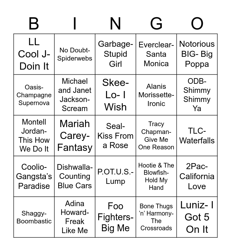 This bingo card has 28 words: 2Pac- California Love, Smashing Pumpkins- 1979, Alanis Morissette- Ironic, Bone Thugs ’n’ Harmony- The Crossroads, Oasis-Champagne Supernova, Garbage- Stupid Girl, No Doubt- Spiderwebs, Coolio- Gangsta’s Paradise, Tracy Chapman- Give Me One Reason, Shaggy- Boombastic, Montell Jordan- This How We Do It, Everclear- Santa Monica, Adina Howard- Freak Like Me, Foo Fighters- Big Me, ODB- Shimmy Shimmy Ya, La Bouche- Be My Lover, Dishwalla- Counting Blue Cars, Michael and Janet Jackson- Scream, Skee-Lo- I Wish, P.OT.U.S.- Lump, LL Cool J- Doin It, Luniz- I Got 5 On It, Seal- Kiss From a Rose, Mariah Carey- Fantasy, TLC- Waterfalls, Hootie & The Blowfish- Hold My Hand, Notorious BIG- Big Poppa and Blues Traveler- Run Around.