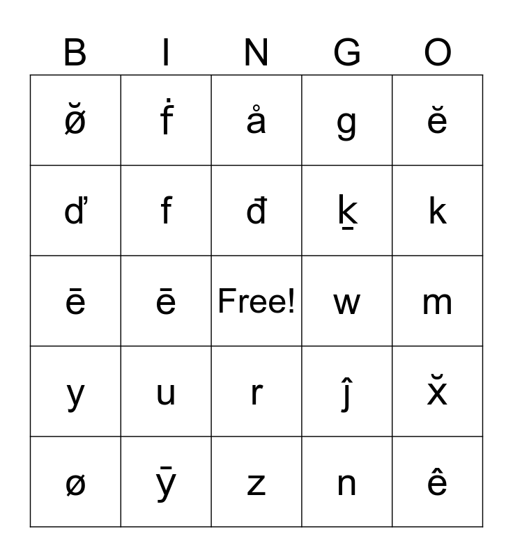 This bingo card has a free space and 75 words: a, ă, å, ā, â, ǎ, b, ƀ, c, ĉ, č, d, đ, ď, e, ē, é, ê, ê̆, ĕ, ə, ē, f, ḟ, g, ǧ, h, ħ, i, ī, î, ǐ, j, ĵ, k, ḵ, l, ľ, m, n, ň, ṉ, o, ō, ô, ǒ, ø, ø̆, ŏ, p, q, r, r̆, ř, s, š, ś, ŝ, t, ť, u, ū, û, ǔ, v, w, ŵ, w̆, x, x̆, y, ȳ, ŷ, z and ž.