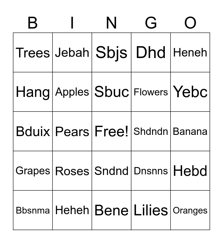This bingo card has a free space and 24 words: Roses, Heheh, Sbuc, Bbsnma, Heneh, Trees, Hang, Jebah, Shdndn, Sndnd, Flowers, Bduix, Dnsnns, Hebd, Apples, Lilies, Banana, Sbjs, Yebc, Pears, Oranges, Grapes, Dhd and Bene.