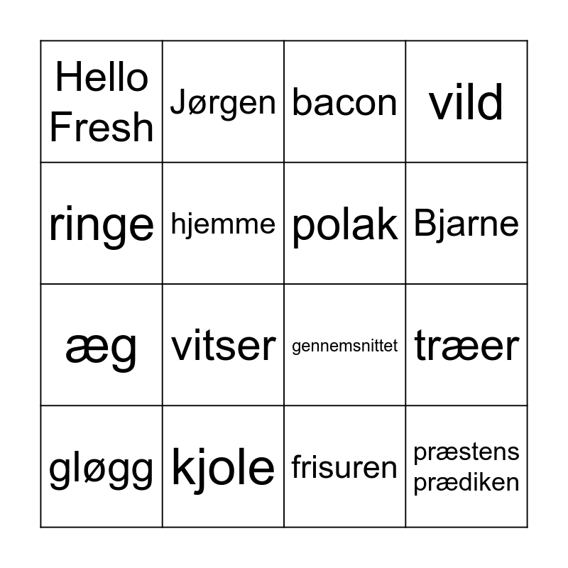 This bingo card has 20 words: træer, liturgisk, bacon, mus, gløgg, ringe, kjole, Hello Fresh, æg, Jørgen, vitser, gennemsnittet, hjemme, præstens prædiken, polak, nissen, Bjarne, vild, frisuren and ho ho ho.