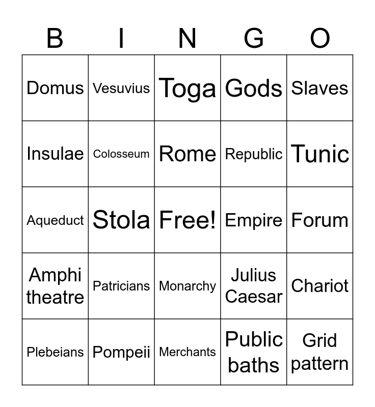 This bingo card has a free space and 24 words: Patricians, Pompeii, Rome, Plebeians, Slaves, Domus, Insulae, Vesuvius, Empire, Monarchy, Republic, Aqueduct, Julius Caesar, Chariot, Colosseum, Public baths, Forum, Toga, Tunic, Stola, Grid pattern, Amphi theatre, Gods and Merchants.