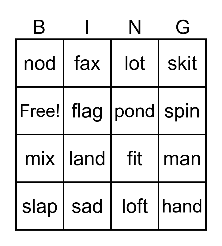 This bingo card has 16 words: sad, man, lot, nod, mix, fax, fit, loft, Free!, flag, slap, skit, land, spin, pond and hand.