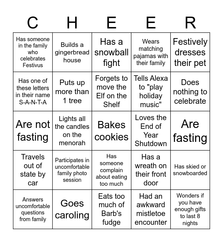 This bingo card has 25 words: Travels out of state by car, Goes caroling, Bakes cookies, Had an awkward mistletoe encounter, Festively dresses their pet, Has someone in the family who celebrates Festivus, Builds a gingerbread house, Has a snowball fight, Loves the End of Year Shutdown, Has skied or snowboarded, Has one of these letters in their name S-A-N-T-A, Puts up more than 1 tree, Eats too much of Barb's fudge, Has a wreath on their front door, Does nothing to celebrate, Answers uncomfortable questions from family, Lights all the candles on the menorah, Forgets to move the Elf on the Shelf, Tells Alexa to "play holiday music", Are fasting, Are not fasting, Participates in uncomfortable family photo session, Has someone complain about eating too much, Wears matching pajamas with their family and Wonders if you have enough gifts to last 8 nights.