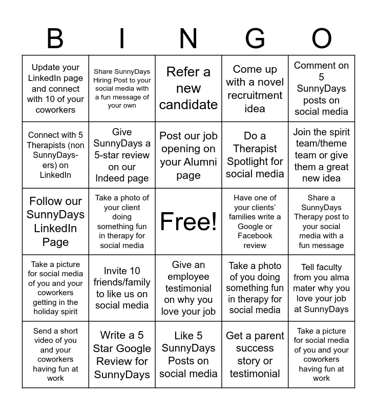 This bingo card has a free space and 24 words: Invite 10 friends/family to like us on social media, Write a 5 Star Google Review for SunnyDays, Post our job opening on your Alumni page, Send a short video of you and your coworkers having fun at work, Comment on 5 SunnyDays posts on social media, Update your LinkedIn page and connect with 10 of your coworkers, Connect with 5 Therapists (non SunnyDays-ers) on LinkedIn, Share SunnyDays Hiring Post to your social media with a fun message of your own, Have one of your clients’ families write a Google or Facebook review, Give an employee testimonial on why you love your job, Do a Therapist Spotlight for social media, Follow our SunnyDays LinkedIn Page, Take a photo of you doing something fun in therapy for social media, Tell faculty from you alma mater why you love your job at SunnyDays, Give SunnyDays a 5-star review on our Indeed page, Get a parent success story or testimonial, Share a SunnyDays Therapy post to your social media with a fun message, Refer a new candidate, Join the spirit team/theme team or give them a great new idea, Take a photo of your client doing something fun in therapy for social media, Take a picture for social media of you and your coworkers having fun at work, Take a picture for social media of you and your coworkers getting in the holiday spirit, Come up with a novel recruitment idea and Like 5 SunnyDays Posts on social media.