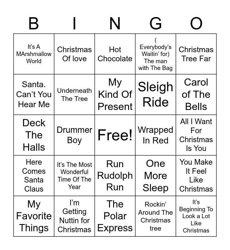 This bingo card has a free space and 53 words: You’re A Mean One ,Mr. Grinch, It’s Beginning To Look a Lot Like Christmas, I Am The Grinch, Rockin’ Around The Christmas tree, It’s The Most Wonderful Time Of The Year, Frosty The Snowman, Christmas Of love, Christmas Is, Santa. Can’t You Hear Me, Snowman, Underneath The Tree, Santa Tell Me, You Make It Feel Like Christmas, One More Sleep, Holly Jolly Christmas, My Favorite Things, My Kind Of Present, Wrapped In Red, I want a Hippopotamus for Christmas, Christmas Tree Far, Drummer Boy, Christmas, Sleigh Ride, It’s A MArshmallow World, Oh, It’s Christmas, I’m Getting Nuttin for Christmas, Linus and Lucy, I’ve Got My Love To Keep Me Warm, Pennies From Heaven, Carol of The Bells, Blue Christmas, Making Christmas, Winter in St Louis, What’s This ?, Surfin Santa, The 12 Days of Christmas, ( Everybody’s Waitin’ for) The man with The Bag, The Polar Express, Hot Chocolate, Holiday Road, Jingle Bell Rock, Winter Wonderland/ Sleigh Ride, All I Want For Christmas Is You, I Saw Mommy Kissing Santa Claus, Santa’s Got a Dirty Job, Run Rudolph Run, Christmas In Hollis, God Rest Ye Merry Gentlemen, Deck The Halls, Here Comes Santa Claus, Good To Be Bad, Let It Snow! Let It Snow! Let It Snow! and A Holly Jolly Christmas.