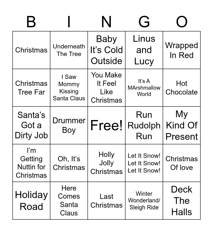 This bingo card has a free space and 63 words: Rockin’ Around The Christmas tree, It’s The Most Wonderful Time Of The Year, Frosty The Snowman, Christmas Of love, Christmas Is, Santa. Can’t You Hear Me, Underneath The Tree, Santa Tell Me, You Make It Feel Like Christmas, One More Sleep, Holly Jolly Christmas, My Favorite Things, My Kind Of Present, Wrapped In Red, I want a Hippopotamus for Christmas, Christmas Tree Far, Drummer Boy, Christmas, Sleigh Ride, It’s A MArshmallow World, Oh, It’s Christmas, I’m Getting Nuttin for Christmas, Linus and Lucy, I’ve Got My Love To Keep Me Warm, Pennies From Heaven, Carol of The Bells, Blue Christmas, Making Christmas, Winter in St Louis, What’s This ?, Surfin Santa, The 12 Days of Christmas, ( Everybody’s Waitin’ for) The man with The Bag, The Polar Express, Hot Chocolate, Holiday Road, Jingle Bell Rock, Winter Wonderland/ Sleigh Ride, All I Want For Christmas Is You, I Saw Mommy Kissing Santa Claus, Santa’s Got a Dirty Job, Run Rudolph Run, Christmas In Hollis, God Rest Ye Merry Gentlemen, Deck The Halls, Here Comes Santa Claus, Good To Be Bad, Let It Snow! Let It Snow! Let It Snow!, A Holly Jolly Christmas, What Christmas Means To Me, Santa Claus Is Coming To Town, Last Christmas, Wonderful Christmastime, The Chipmunk Song, Oh Santa, Baby It’s Cold Outside, Mistletoe And Holly, Holidays, Little Saint Nick, Feliz Navidad, Driving Home For Christmas, My Only Wish and Jingle Bells.