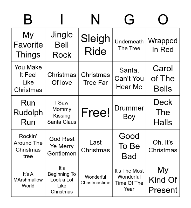 This bingo card has a free space and 61 words: You’re A Mean One ,Mr. Grinch, It’s Beginning To Look a Lot Like Christmas, I Am The Grinch, Rockin’ Around The Christmas tree, It’s The Most Wonderful Time Of The Year, Frosty The Snowman, Christmas Of love, Christmas Is, Santa. Can’t You Hear Me, Snowman, Underneath The Tree, Santa Tell Me, You Make It Feel Like Christmas, One More Sleep, Holly Jolly Christmas, My Favorite Things, My Kind Of Present, Wrapped In Red, I want a Hippopotamus for Christmas, Christmas Tree Far, Drummer Boy, Sleigh Ride, It’s A MArshmallow World, Oh, It’s Christmas, I’m Getting Nuttin for Christmas, Linus and Lucy, I’ve Got My Love To Keep Me Warm, Pennies From Heaven, Carol of The Bells, The 12 Days of Christmas, ( Everybody’s Waitin’ for) The man with The Bag, The Polar Express, Hot Chocolate, Holiday Road, Jingle Bell Rock, Winter Wonderland/ Sleigh Ride, All I Want For Christmas Is You, I Saw Mommy Kissing Santa Claus, Santa’s Got a Dirty Job, Run Rudolph Run, Christmas In Hollis, God Rest Ye Merry Gentlemen, Deck The Halls, Here Comes Santa Claus, Good To Be Bad, Let It Snow! Let It Snow! Let It Snow!, A Holly Jolly Christmas, What Christmas Means To Me, Santa Claus Is Coming To Town, Last Christmas, Wonderful Christmastime, The Chipmunk Song, Oh Santa, Baby It’s Cold Outside, Mistletoe And Holly, Holidays, Little Saint Nick, Feliz Navidad, Driving Home For Christmas, My Only Wish and Jingle Bells.