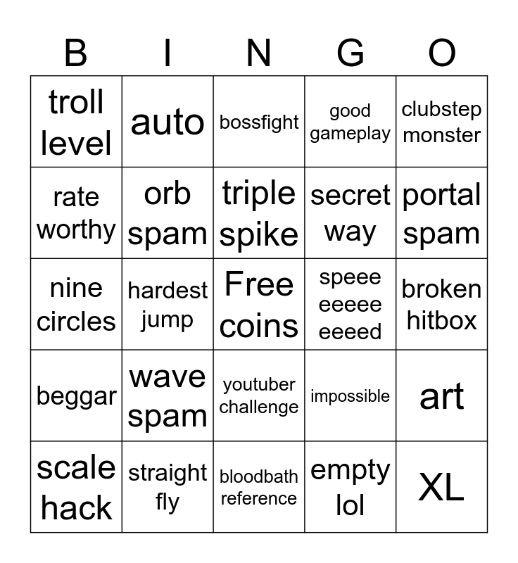 This bingo card has a free space and 24 words: wave spam, straight fly, triple spike, scale hack, clubstep monster, troll level, rate worthy, auto, speee eeeee eeeed, youtuber challenge, secret way, nine circles, impossible, art, orb spam, empty lol, broken hitbox, bossfight, portal spam, hardest jump, XL, beggar, good gameplay and bloodbath reference.