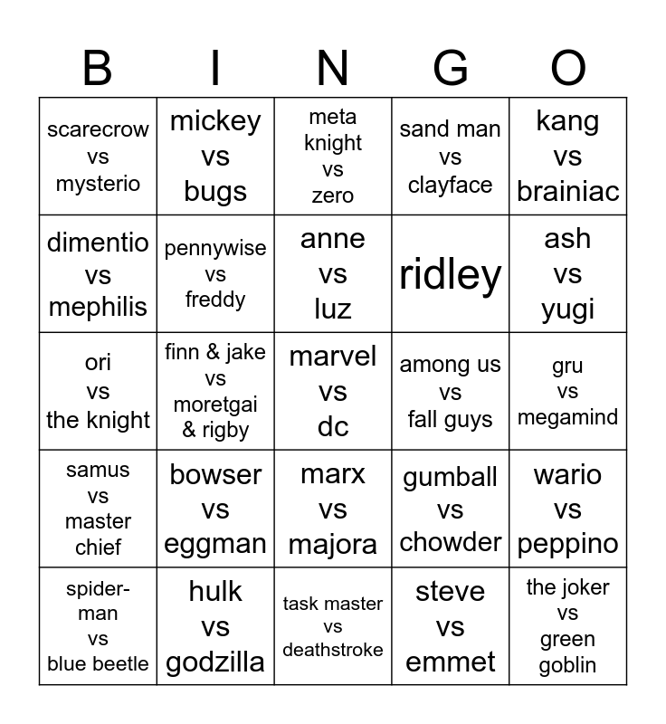 This bingo card has a free space and 24 words: bowser vs eggman, hulk vs godzilla, anne vs luz, spider-man vs blue beetle, kang vs brainiac, scarecrow vs mysterio, dimentio vs mephilis, mickey vs bugs, among us vs fall guys, marx vs majora, ridley, ori vs the knight, gumball vs chowder, wario vs peppino, pennywise vs freddy, steve vs emmet, gru vs megamind, meta knight vs zero, ash vs yugi, finn & jake vs moretgai & rigby, the joker vs green goblin, samus vs master chief, sand man vs clayface and task master vs deathstroke.