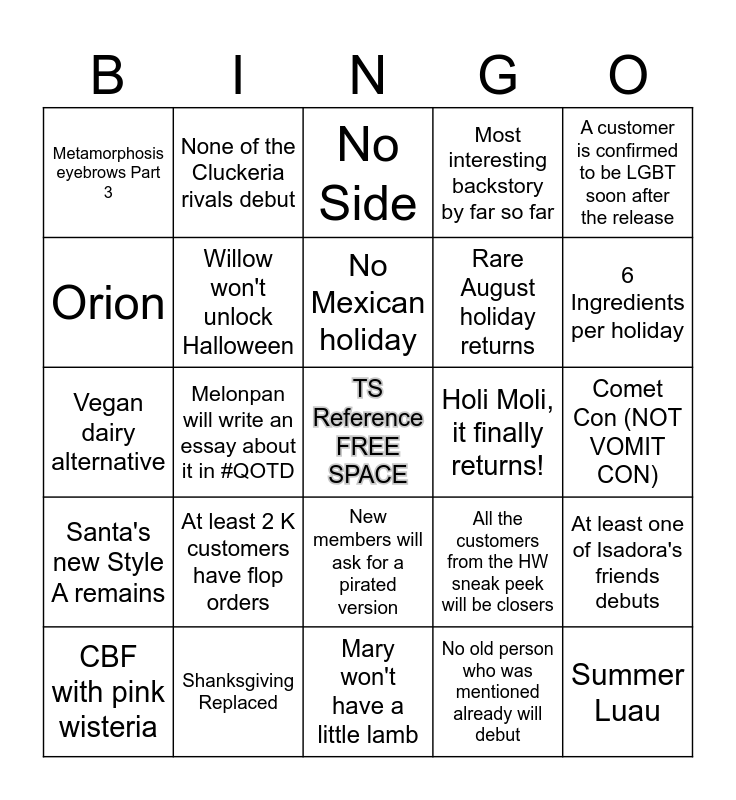 This bingo card has a free space and 24 words: At least 2 K customers have flop orders, Shanksgiving Replaced, No Mexican holiday, CBF with pink wisteria, A customer is confirmed to be LGBT soon after the release, Metamorphosis eyebrows Part 3, Orion, None of the Cluckeria rivals debut, Holi Moli, it finally returns!, New members will ask for a pirated version, Rare August holiday returns, Vegan dairy alternative, All the customers from the HW sneak peek will be closers, At least one of Isadora's friends debuts, Willow won't unlock Halloween, No old person who was mentioned already will debut, Comet Con (NOT VOMIT CON), No Side, 6 Ingredients per holiday, Melonpan will write an essay about it in #QOTD, Summer Luau, Santa's new Style A remains, Most interesting backstory by far so far and Mary won't have a little lamb.