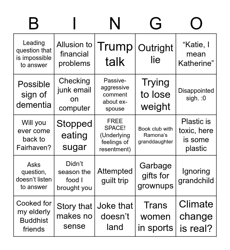 This bingo card has a free space and 29 words: Gluten- free, Story that makes no sense, Trump talk, Unhelpful medical opinion / advice, “Katie, I mean Katherine”, Leading question that is impossible to answer, Checking junk email on computer, Passive-aggressive comment about ex-spouse, Book club with Ramona’s granddaughter, Ignoring grandchild, Cooked for my elderly Buddhist friends, Stopped eating sugar, Trans women in sports, Climate change is real?, Will you ever come back to Fairhaven?, Willful Ignorance of K’s career, Joke that doesn’t land, Garbage gifts for grownups, Disappointed sigh. :0, Asks question, doesn’t listen to answer, Didn’t season the food I brought you, Disappointed face :(, Trying to lose weight, Plastic is toxic, here is some plastic, Possible sign of dementia, Allusion to financial problems, Attempted guilt trip, Outright lie and Knowingly eat something that triggers IBS.