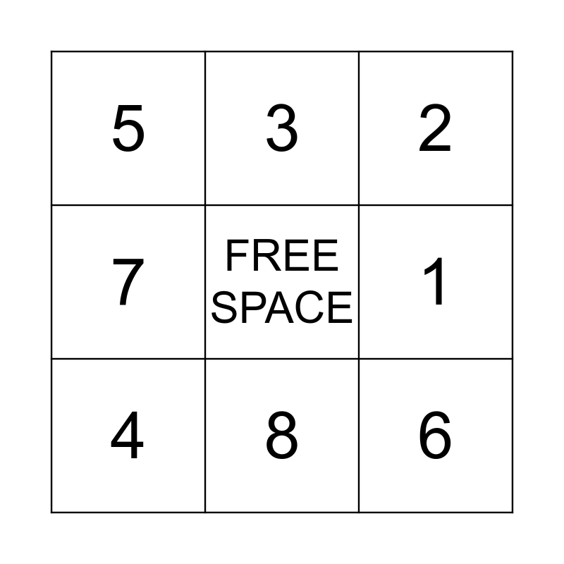 This bingo card has a free space and 8 words: 1, 2, 3, 4, 5, 6, 7 and 8.