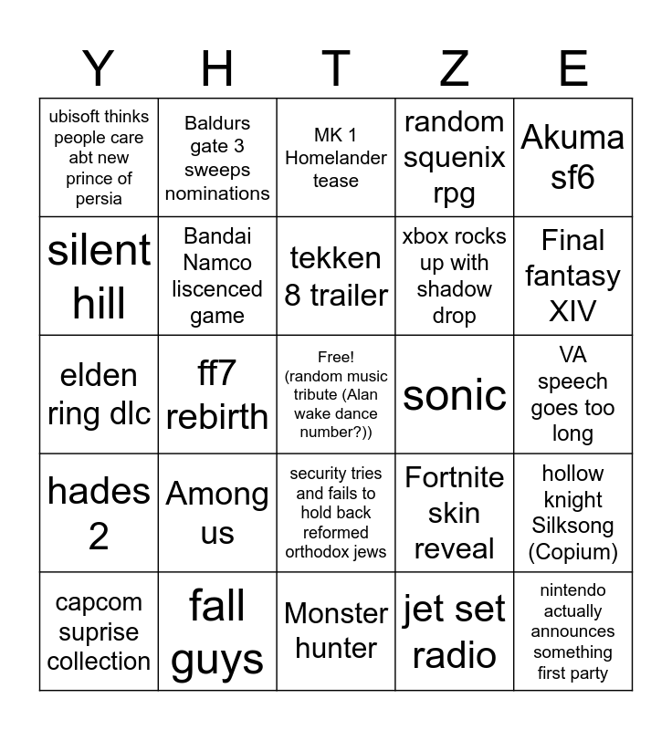 This bingo card has a free space and 24 words: Among us, fall guys, tekken 8 trailer, capcom suprise collection, Akuma sf6, ubisoft thinks people care abt new prince of persia, silent hill, Baldurs gate 3 sweeps nominations, sonic, security tries and fails to hold back reformed orthodox jews, xbox rocks up with shadow drop, elden ring dlc, Fortnite skin reveal, hollow knight Silksong (Copium), Bandai Namco liscenced game, jet set radio, VA speech goes too long, MK 1 Homelander tease, Final fantasy XIV, ff7 rebirth, nintendo actually announces something first party, hades 2, random squenix rpg and Monster hunter.