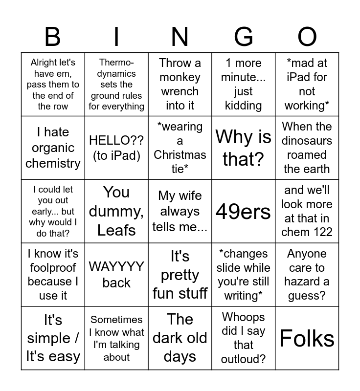 This bingo card has 25 words: WAYYYY back, The dark old days, *wearing a Christmas tie*, It's simple / It's easy, *mad at iPad for not working*, Alright let's have em, pass them to the end of the row, I hate organic chemistry, Thermo-dynamics sets the ground rules for everything, 49ers, It's pretty fun stuff, Why is that?, I could let you out early... but why would I do that?, *changes slide while you're still writing*, Anyone care to hazard a guess?, HELLO??(to iPad), Folks, and we'll look more at that in chem 122, Throw a monkey wrench into it, When the dinosaurs roamed the earth, You dummy, Leafs, My wife always tells me..., Sometimes I know what I'm talking about, I know it's foolproof because I use it, 1 more minute... just kidding and Whoops did I say that outloud?.