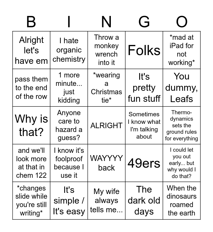 This bingo card has a free space and 26 words: WAYYYY back, The dark old days, *wearing a Christmas tie*, It's simple / It's easy, *mad at iPad for not working*, Alright let's have em, pass them to the end of the row, I hate organic chemistry, Thermo-dynamics sets the ground rules for everything, 49ers, It's pretty fun stuff, Why is that?, I could let you out early... but why would I do that?, *changes slide while you're still writing*, Anyone care to hazard a guess?, HELLO?? (to iPad), Folks, and we'll look more at that in chem 122, Throw a monkey wrench into it, When the dinosaurs roamed the earth, You dummy, Leafs, My wife always tells me..., Sometimes I know what I'm talking about, I know it's foolproof because I use it, 1 more minute... just kidding and Whoops did I say that outloud?.