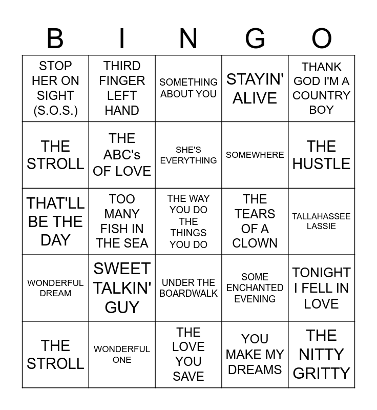 This bingo card has 80 words: SOME KIND OF WONDERFUL, SOMEDAY WE'LL BE TOGETHER, SOMETHING ABOUT YOU, SOUL MAN, SOUL CITY WALKIN', SOUTH STREET, SPEEDO, SPINNING TOP, SPLISH SPLASH, STAGGER LEE, THE LAST TIME, SHE'S A LADY, STAYIN' ALIVE, STOP HER ON SIGHT (S.O.S.), STOP! IN THE NAME OF LOVE, THE STROLL, SUMMERTIME BLUES, SWEET TALKIN' GUY, TAKING CARE OF BUSINESS, TALLAHASSEE LASSIE, TELL HIM, THANK GOD I'M A COUNTRY BOY, THAT'LL BE THE DAY, SHE'S EVERYTHING, THE ABC's OF LOVE, THE CLAPPING SONG, SHY ONE, THE FLY, THE GIRL'S ALRIGHT WITH ME, THE HUCKLEBUCK, THE HUSTLE, SILHOUETTES, THE LOVE YOU SAVE, THE NITTY GRITTY, THE STROLL, THE TEARS OF A CLOWN, (I've Had) THE TIME OF MY LIFE, SILLY LOVE SONGS, THE WANDERER, THE WAY YOU DO THE THINGS YOU DO, SMOKE GETS IN YOUR EYES, THERE IS, THERE'S NO STOPPING US NOW, THESE BOOTS ARE MADE FOR WALKING, THINK, THIRD FINGER LEFT HAND, THIS LITTLE GIRL, THIS OLD HEART OF MINE, SO MUCH IN LOVE, TIGER, TONIGHT I FELL IN LOVE, TOO MANY FISH IN THE SEA, SOME ENCHANTED EVENING, TRICKLE TRICKLE, TROULE IN PARADISE, TWIST AND SHOUT, TWIST TWIST SENORA, TWISTIN' THE NIGHT AWAY, TWO HEARTS, UNDER THE BOARDWALK, SOMEWHERE, WE ARE FAMILY, WHERE DID OUR LOVE GO, WHO LET THE DOGS OUT, WHO PUT THE BOMP?, WHOLE LOTTA LOVING, WHY DO FOOLS FALL IN LOVE, WILD ONE, WITH THIS RING, WITHOUT THE ONE YOU LOVE, WONDERFUL DREAM, WONDERFUL ONE, WOOLEY BULLY, YAKETY YAK, YOU CAN'T HURRY LOVE, SPANISH HARLEM, YOU MAKE MY DREAMS, YOU'RE THE ONE THAT I WANT, RETURN TO SENDER and MISTER LEE.