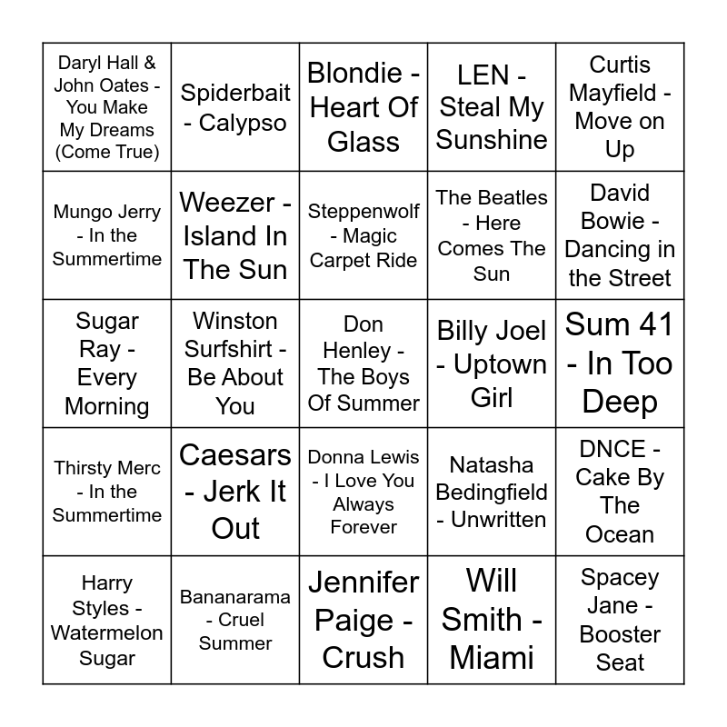 This bingo card has 60 words: Ini Kamoze - Here Comes the Hotstepper, Bananarama - Cruel Summer, Powderfinger - Sunsets, Thirsty Merc - In the Summertime, Will Smith - Miami, Bryan Adams - Summer Of '69, Weezer - Island In The Sun, Violent Femmes - Blister In The Sun, The Beatles - Here Comes The Sun, Katrina & The Waves - Walking On Sunshine, LEN - Steal My Sunshine, Boney M. - Sunny, Mungo Jerry - In the Summertime, Smash Mouth - Walkin' On The Sun, Bob Marley & The Wailers - Could You Be Loved, Daryl Hall & John Oates - You Make My Dreams (Come True), Don Henley - The Boys Of Summer, Curtis Mayfield - Move on Up, Rupert Holmes - Escape (The Pina Colada Song), Steppenwolf - Magic Carpet Ride, Billy Joel - Uptown Girl, Blondie - Heart Of Glass, Harry Styles - Watermelon Sugar, DNCE - Cake By The Ocean, Rihanna - If It's Lovin' That You Want, The B-52's - Rock Lobster, Megan Thee Stallion - Hot Girl Summer, The Lonely Island - I'm On A Boat, David Bowie - Dancing in the Street, Nelly - Hot In Herre, Jimmy Buffett - Margaritaville, Jennifer Lopez - Love Don't Cost a Thing, Paris Hilton - Stars Are Blind, Dragon - Are You Old Enough, Spiderbait - Calypso, Yolanda Be Cool - We No Speak Americano, Boy & Bear - Southern Sun, Winston Surfshirt - Be About You, All Saints - Pure Shores, Sugar Ray - Every Morning, New Radicals - You Get What You Give, Caesars - Jerk It Out, Sum 41 - In Too Deep, Hoku - Perfect Day - Chris Lord Alge Mix, Natasha Bedingfield - Unwritten, Alex Gaudino - Destination Calabria, San Cisco - Awkward - EP Version, The Rapture - Get Myself Into It, Ocean Alley - Yellow Mellow, Donna Lewis - I Love You Always Forever, Jennifer Paige - Crush, Morcheeba - Rome Wasn't Built in a Day, Sticky Fingers - Australia Street, Black Eyed Peas - Pump It, Violent Femmes - Blister in the Sun, Red Hot Chili Peppers - Can't Stop, Ween - Ocean Man, 2Pac - California Love, Spacey Jane - Booster Seat and Client Liaison - Off White Limousine.