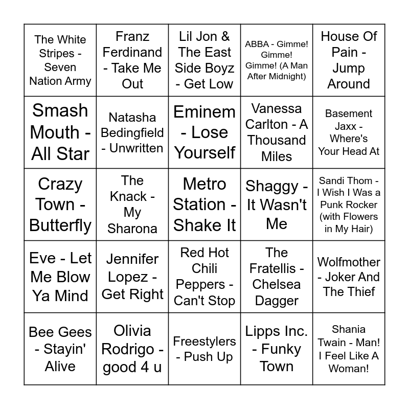This bingo card has 62 words: Fergie - London Bridge, Olivia Rodrigo - good 4 u, Miley Cyrus - Party In The U.S.A., Eve - Let Me Blow Ya Mind, Shania Twain - Man! I Feel Like A Woman!, Natalie Imbruglia - Torn, Natasha Bedingfield - Unwritten, Neil Diamond - Sweet Caroline, Vanessa Carlton - A Thousand Miles, Wheatus - Teenage Dirtbag, ABBA - Gimme! Gimme! Gimme! (A Man After Midnight), Linkin Park - In the End, Smash Mouth - All Star, Panic! At The Disco - I Write Sins Not Tragedies, Evanescence - Bring Me To Life, The White Stripes - Seven Nation Army, Metro Station - Shake It, House Of Pain - Jump Around, Gwen Stefani - Hollaback Girl, Eminem - Lose Yourself, Shaggy - It Wasn't Me, Lil Jon & The East Side Boyz - Get Low, Bee Gees - Stayin' Alive, Lipps Inc. - Funky Town, Chumbawamba - Tubthumping, Kylie Minogue - Can't Get You out of My Head, Good Charlotte - The Anthem, Dizzee Rascal - Dance Wiv Me, Wolfmother - Joker And The Thief, The Presets - My People, The Offspring - Pretty Fly (For A White Guy), 3 Doors Down - Kryptonite, Uncle Kracker - Follow Me, Train - Drops of Jupiter (Tell Me), Sandi Thom - I Wish I Was a Punk Rocker (with Flowers in My Hair), Franz Ferdinand - Take Me Out, The Veronicas - Untouched, Bonnie Tyler - Total Eclipse of the Heart, The Knack - My Sharona, Bomfunk MC's - Freestyler, Crazy Town - Butterfly, Nelly - Ride Wit Me, Jennifer Lopez - Get Right, Mike WiLL Made-It - 23, Basement Jaxx - Where's Your Head At, The Fratellis - Chelsea Dagger, Quad City DJ's - Space Jam, Kendrick Lamar - King Kunta, Art vs Science - Parlez Vous Francais, Lily Allen - Not Fair, Red Hot Chili Peppers - Can't Stop, Freestylers - Push Up, Taylor Swift - We Are Never Ever Getting Back Together, The Cardigans - Lovefool, Bag Raiders - Shooting Stars, Daft Punk - One More Time, Kym Mazelle - Young Hearts Run Free, Missy Elliott - Lose Control, LMC - Take Me To The Clouds Above, Client Liaison - Off White Limousine, Fatman Scoop - Be Faithful and Dire Straits - Walk Of Life.