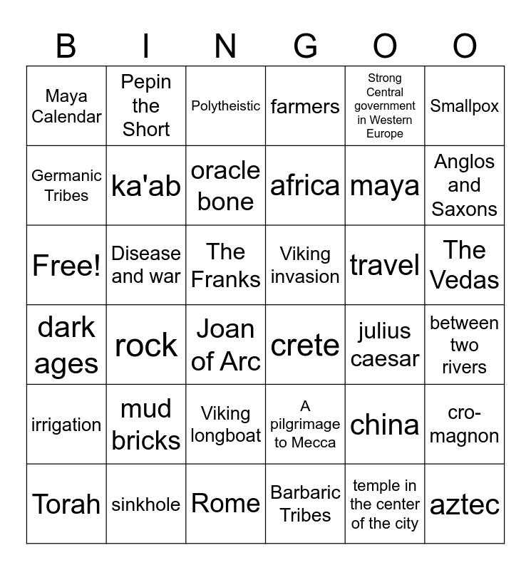 This bingo card has 36 words: A pilgrimage to Mecca, Viking longboat, Barbaric Tribes, Germanic Tribes, dark ages, Viking invasion, ka'ab, Rome, Strong Central government in Western Europe, china, Anglos and Saxons, farmers, cro-magnon, Disease and war, africa, Maya Calendar, irrigation, travel, Free!, Polytheistic, The Franks, rock, crete, Joan of Arc, julius caesar, Pepin the Short, maya, sinkhole, oracle bone, Smallpox, aztec, Torah, between two rivers, The Vedas, mud bricks and temple in the center of the city.