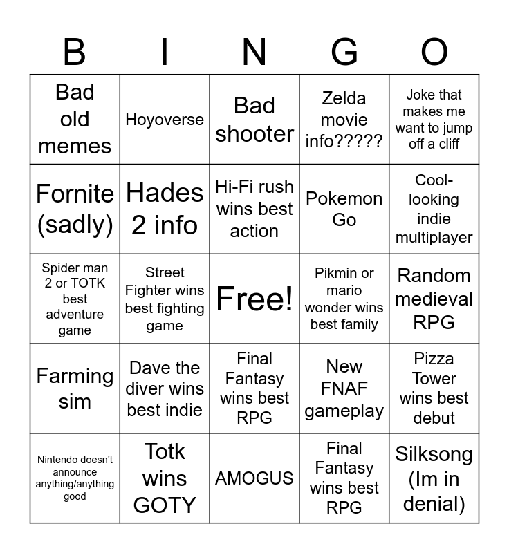 This bingo card has a free space and 24 words: Dave the diver wins best indie, Totk wins GOTY, Hi-Fi rush wins best action, Nintendo doesn't announce anything/anything good, Joke that makes me want to jump off a cliff, Bad old memes, Fornite (sadly), Hoyoverse, Pikmin or mario wonder wins best family, Final Fantasy wins best RPG, Pokemon Go, Spider man 2 or TOTK best adventure game, New FNAF gameplay, Pizza Tower wins best debut, Hades 2 info, Final Fantasy wins best RPG, Random medieval RPG, Bad shooter, Cool-looking indie multiplayer, Street Fighter wins best fighting game, Silksong (Im in denial), Farming sim, Zelda movie info????? and AMOGUS.