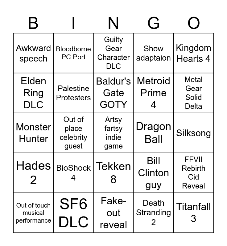 This bingo card has a free space and 24 words: BioShock 4, SF6 DLC, Baldur's Gate GOTY, Out of touch musical performance, Kingdom Hearts 4, Awkward speech, Elden Ring DLC, Bloodborne PC Port, Dragon Ball, Tekken 8, Metroid Prime 4, Monster Hunter, Bill Clinton guy, FFVII Rebirth Cid Reveal, Palestine Protesters, Death Stranding 2, Silksong, Guilty Gear Character DLC, Metal Gear Solid Delta, Out of place celebrity guest, Titanfall 3, Hades 2, Show adaptaion and Fake-out reveal.