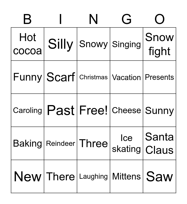This bingo card has a free space and 24 words: Reindeer, There, Christmas, New, Snow fight, Hot cocoa, Funny, Silly, Cheese, Three, Vacation, Caroling, Ice skating, Santa Claus, Scarf, Mittens, Sunny, Snowy, Presents, Past, Saw, Baking, Singing and Laughing.