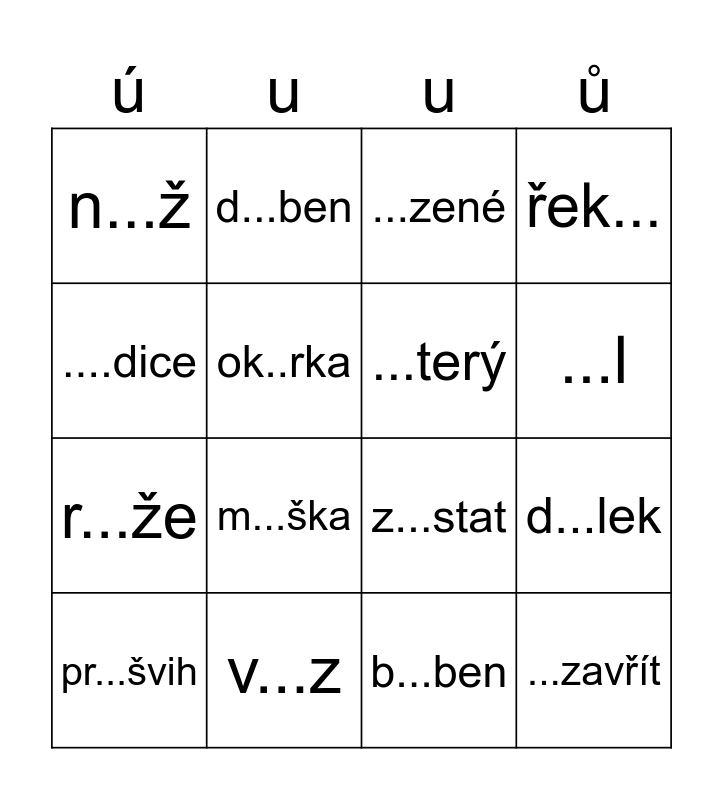 This bingo card has 24 words: ...sta, dom...., ...l, l...k, ....dice, n...ž, ok..rka, d...ben, v...z, ...hoř, r...že, z...stat, b...k, d...b, ...terý, dol...., b...ben, ...zené, m...ška, d...lek, pr...švih, ...zavřít, řek... and h...lka.