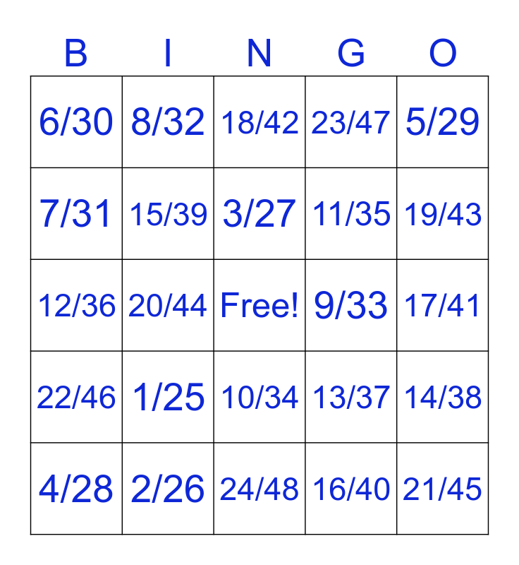 This bingo card has a free space and 24 words: 1/25, 2/26, 3/27, 4/28, 5/29, 6/30, 7/31, 8/32, 9/33, 10/34, 11/35, 12/36, 13/37, 14/38, 15/39, 16/40, 17/41, 18/42, 19/43, 20/44, 21/45, 22/46, 23/47 and 24/48.
