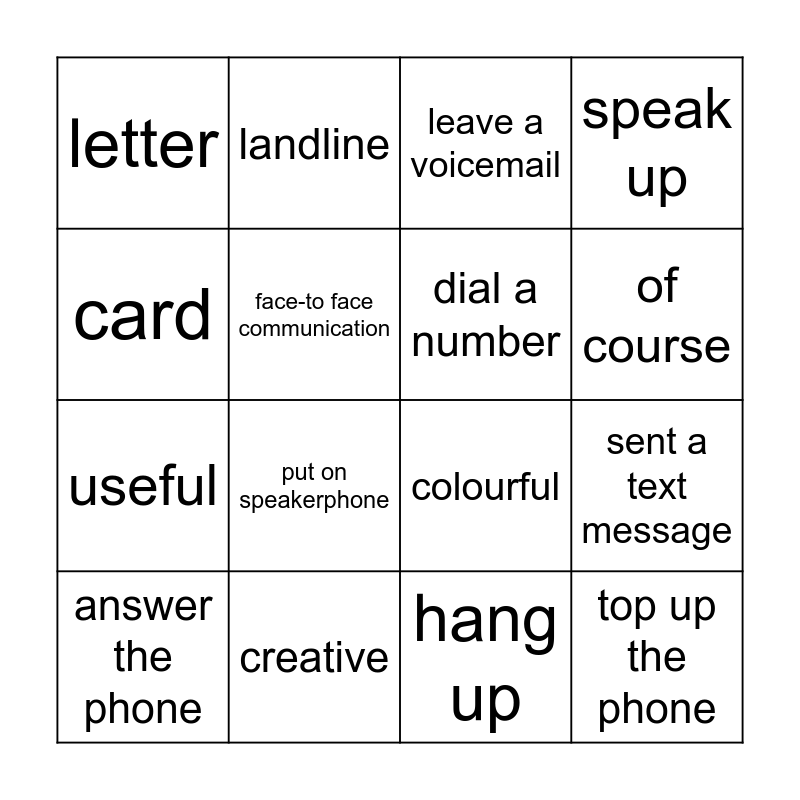 This bingo card has 24 words: much less, more, of course, I am surprised!, card, letter, face-to face communication, landline, creative, international, useful, colourful, be engaged, call back, dial a number, download a ringtone, hang up, leave a voicemail, put on speakerphone, sent a text message, answer the phone, top up the phone, speak up and wrong number.