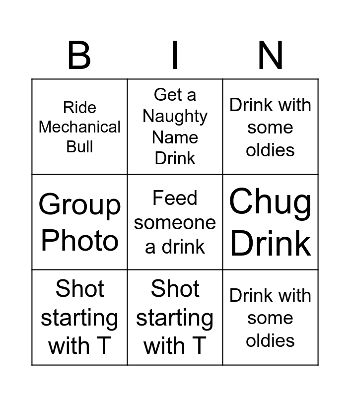 ⚠ This card has duplicate items: Drink with some oldies (2), Ride Mechanical Bull (2), Get a Naughty Name Drink (2), Shot starting with T (2)