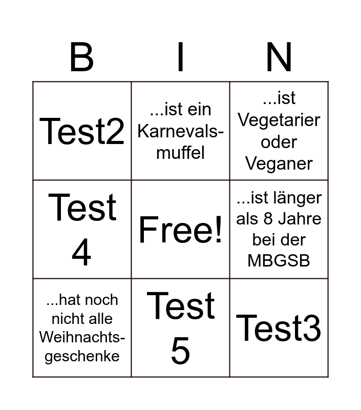 This bingo card has a free space and 8 words: ...ist länger als 8 Jahre bei der MBGSB, ...ist Vegetarier oder Veganer, ...ist ein Karnevals-muffel, ...hat noch nicht alle Weihnachts-geschenke, Test2, Test3, Test 4 and Test 5.