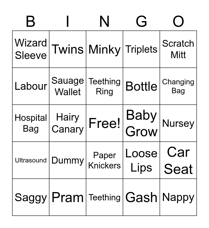 This bingo card has a free space and 29 words: Saggy, Sleepless Nights, Hairy Canary, John Wayne, Wizard Sleeve, Minky, Sauage Wallet, Dummy, Baby Grow, Pram, Nursey, Nappy, Teething, Gash, Changing Bag, Wet Wipes, Paper Knickers, Ultrasound, Scratch Mitt, Hospital Bag, Loose Lips, High Chair, Bottle, Labour, Triplets, Twins, Car Seat, Teething Ring and Blanket.
