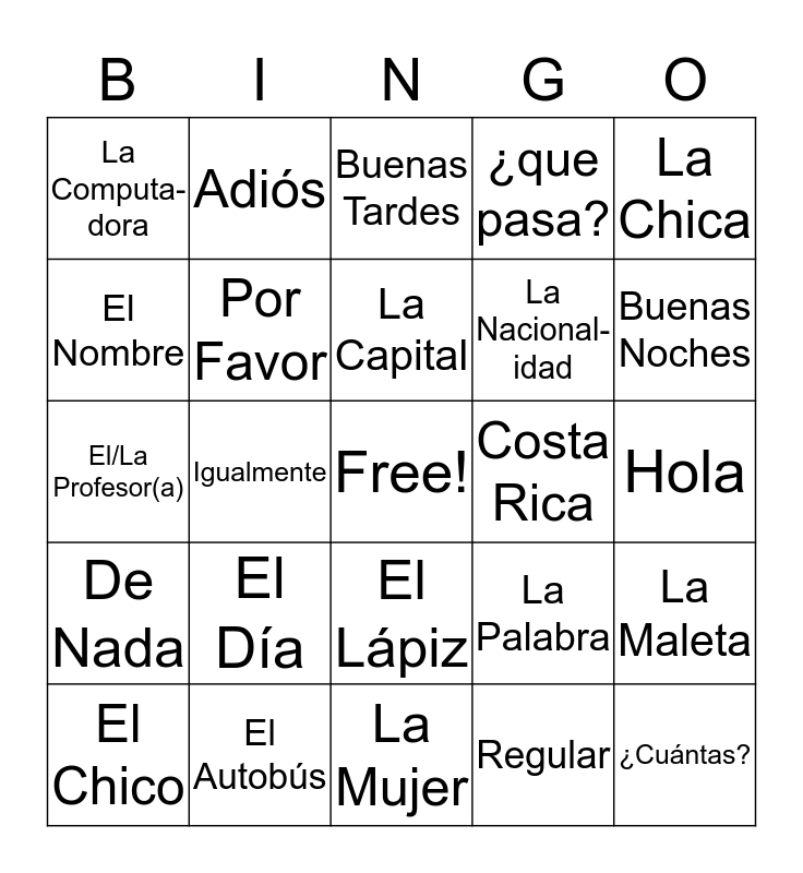 This bingo card has a free space and 24 words: El Día, El Autobús, La Capital, El Chico, La Chica, La Computa- dora, El Nombre, Adiós, Costa Rica, El Lápiz, La Nacional- idad, El/La Profesor(a), La Palabra, La Maleta, Por Favor, Regular, Hola, Buenas Tardes, Buenas Noches, Igualmente, ¿Cuántas?, De Nada, ¿que pasa? and La Mujer.