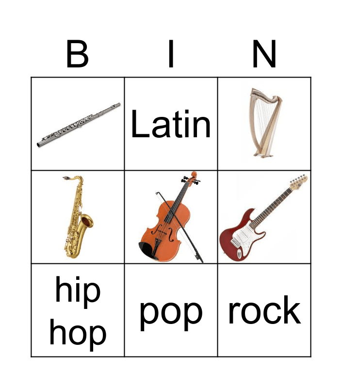 This bingo card has 8 images, a free space and 6 words: classical, Latin, rock, hip hop, pop and jazz.