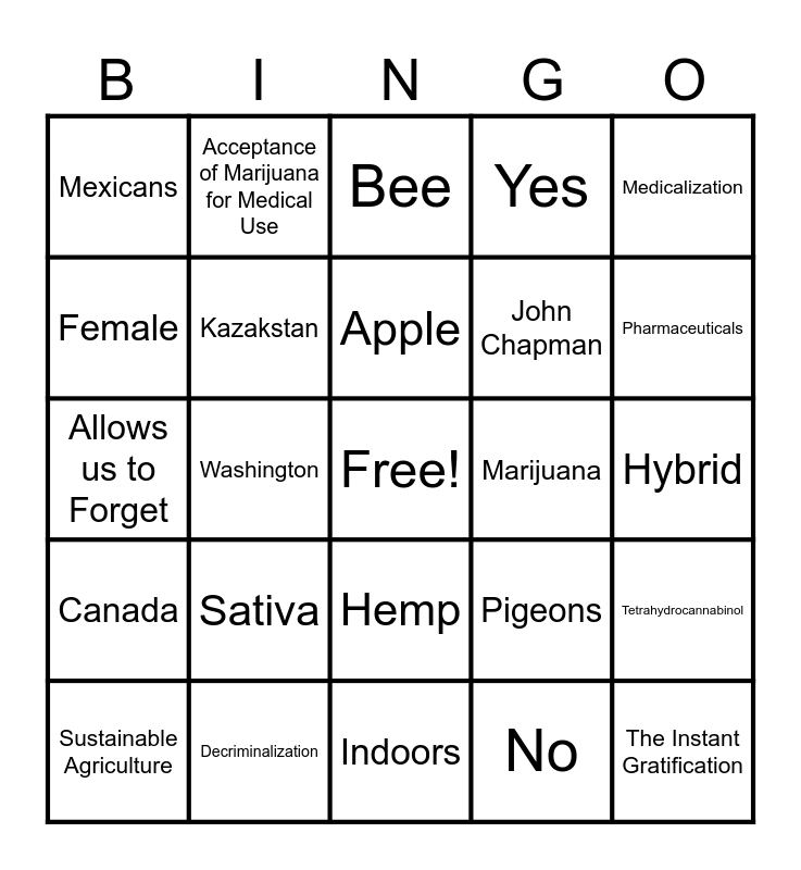 This bingo card has a free space and 33 words: Christians, War on Drugs, Washington, THC, Canada, Kazakstan, Medicalization, Sustainable Agriculture, Acceptance of Marijuana for Medical Use, Overregulation, Apple, Bee, Dog, Weed, Marijuana, Pharmaceuticals, Decriminalization, Allows us to Forget, Sativa, Pigeons, Hemp, Pomegranate, Mexicans, Hybrid, Indoors, The Instant Gratification, Yes, John Chapman, Female, Tetrahydrocannabinol, Being in the Present, No and Musicians.