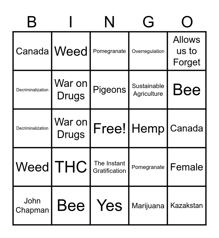 ⚠ This card has duplicate items: Apple (2), Bee (2), Dog (2), Weed (2), Marijuana (2), Christians (2), War on Drugs (2), Medicalization (2), Sustainable Agriculture (2), Acceptance of Marijuana for Medical Use (2), Overregulation (2), Pharmaceuticals (2), Decriminalization (2), Washington (2), THC (2), Canada (2), Kazakstan (2), Allows us to Forget (2), Sativa (2), Pigeons (2), Hemp (2), Pomegranate (2), John Chapman (2), Female (2), Tetrahydrocannabinol (2), Mexicans (2)