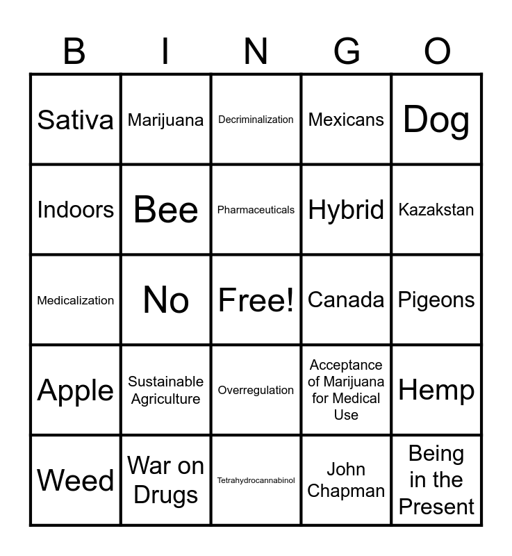 This bingo card has a free space and 33 words: The Instant Gratification, Yes, No, Musicians, Apple, Bee, Dog, Weed, Marijuana, Christians, Pharmaceuticals, Decriminalization, Washington, THC, Canada, Kazakstan, War on Drugs, Medicalization, Sustainable Agriculture, Acceptance of Marijuana for Medical Use, Overregulation, Allows us to Forget, Sativa, Pigeons, Tetrahydrocannabinol, Being in the Present, Mexicans, Hybrid, Indoors, Hemp, Pomegranate, John Chapman and Female.