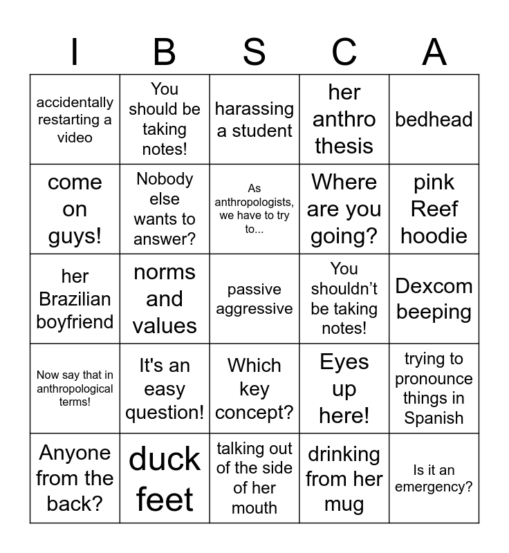 This bingo card has a free space and 24 words: It's an easy question!, duck feet, As anthropologists, we have to try to..., Anyone from the back?, bedhead, accidentally restarting a video, come on guys!, You should be taking notes!, You shouldn’t be taking notes!, Which key concept?, Where are you going?, her Brazilian boyfriend, Eyes up here!, trying to pronounce things in Spanish, Nobody else wants to answer?, drinking from her mug, Dexcom beeping, harassing a student, pink Reef hoodie, norms and values, Is it an emergency?, Now say that in anthropological terms!, her anthro thesis and talking out of the side of her mouth.