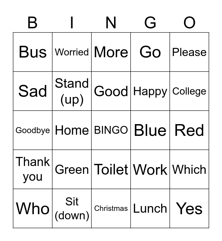 This bingo card has a free space and 40 words: Hello, Goodbye, How are you?, Stand (up), Sit (down), Toilet, Good, Morning, Please, Thank you, Home, Go, Yes, Red, Blue, Green, Yellow, Bus, No, More, Which, Lunch, Happy, Sad, Calm, Wait, Drink, Walk, Friend, Tired, Where, Who, Help, Work, College, Christmas, New, Sorry, Worried and Ill.