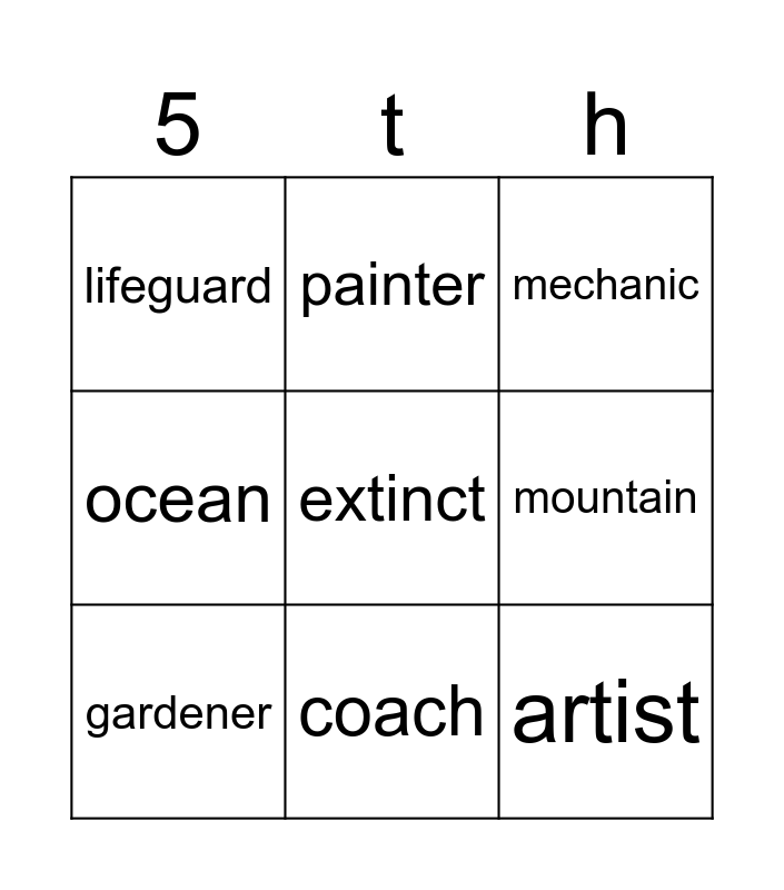 This bingo card has 21 words: keeper, hunter, painter, guide, biologist, gardener, lifeguard, mechanic, photojournalist, coach, artist, ocean, marine, tennis, mountain, creature, disappear, damage, extinct, environment and protect.