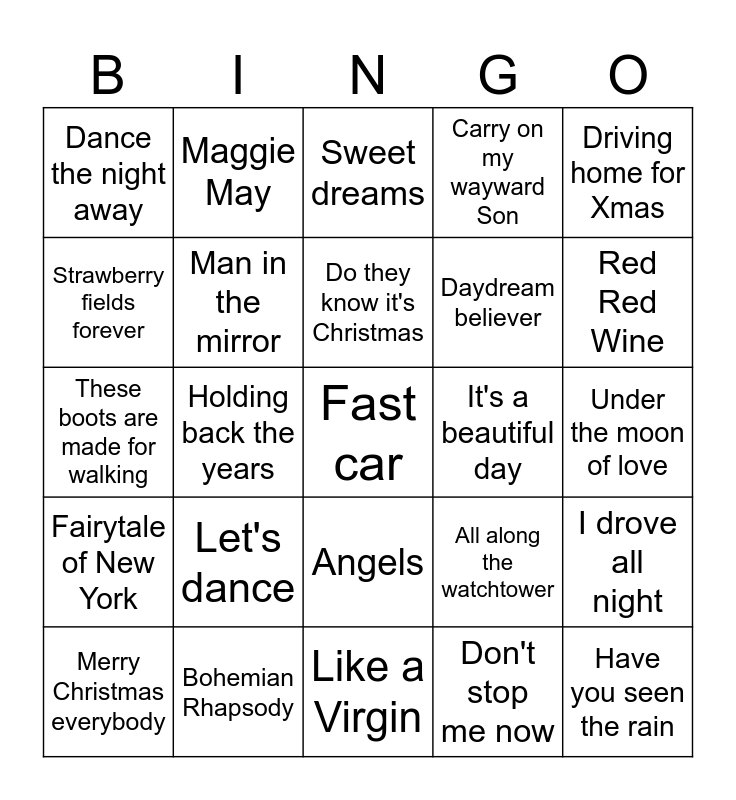 This bingo card has 25 words: Let's dance, Like a Virgin, Do they know it's Christmas, Merry Christmas everybody, Driving home for Xmas, Dance the night away, Strawberry fields forever, Maggie May, It's a beautiful day, Angels, Daydream believer, These boots are made for walking, All along the watchtower, I drove all night, Man in the mirror, Have you seen the rain, Under the moon of love, Sweet dreams, Red Red Wine, Holding back the years, Fast car, Bohemian Rhapsody, Fairytale of New York, Carry on my wayward Son and Don't stop me now.